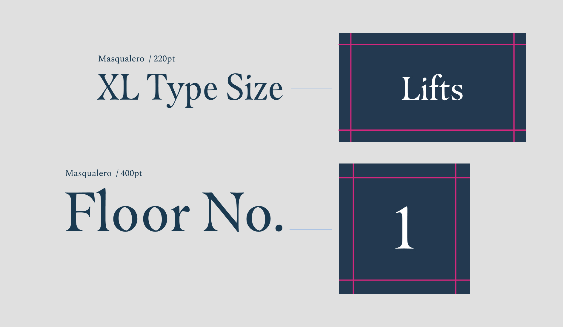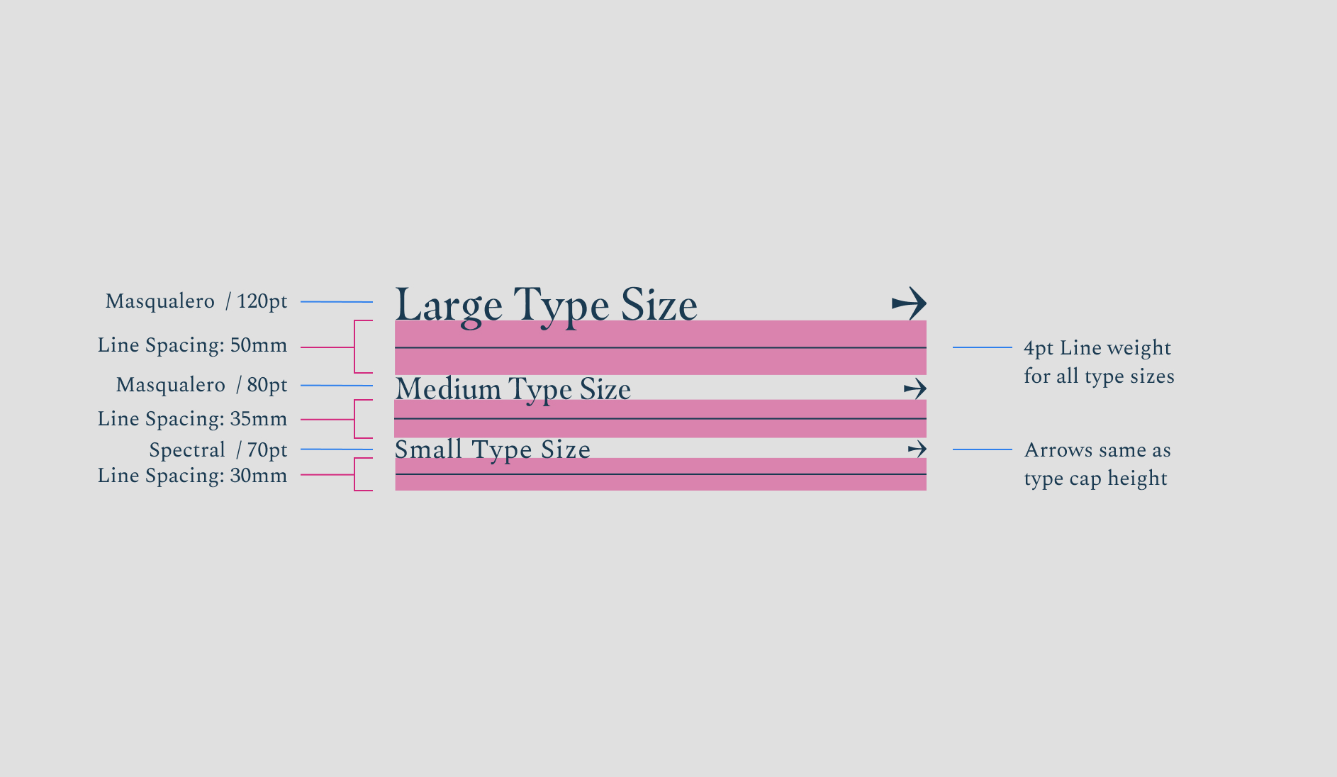 There are three main type sizes we use on our wayfinding. Lines at a 4pt weight are used to increase the legibility of the direction. Arrows are sized at the same cap height as the corresponding type size used.