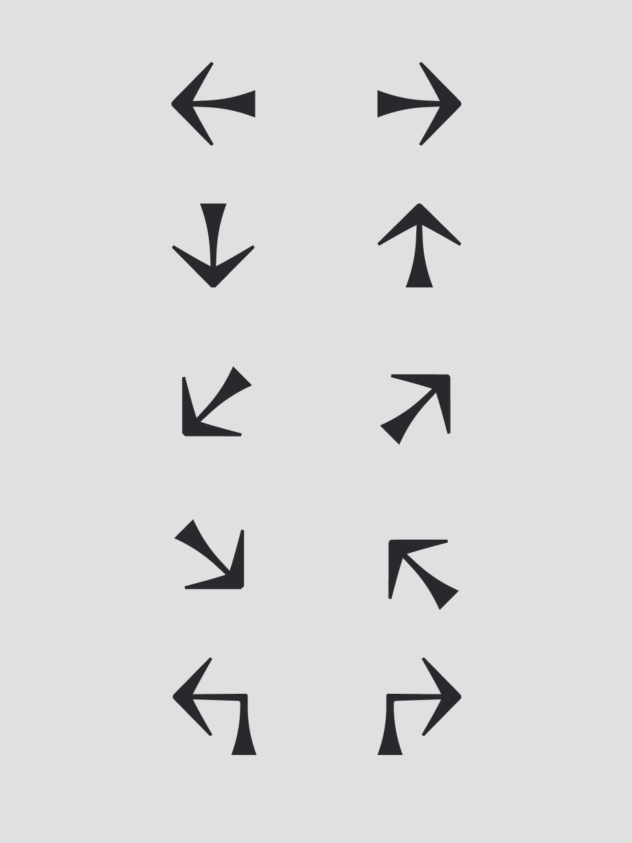 When using arrows and icons on wayfinding, make sure the sizing is always consistent. We use icons from the Google Materials Library. Our arrow is a custom-made arrow that fits with our hero typeface, Masqualero. This arrow is supplied in the wayfinding pack at the top of the page.