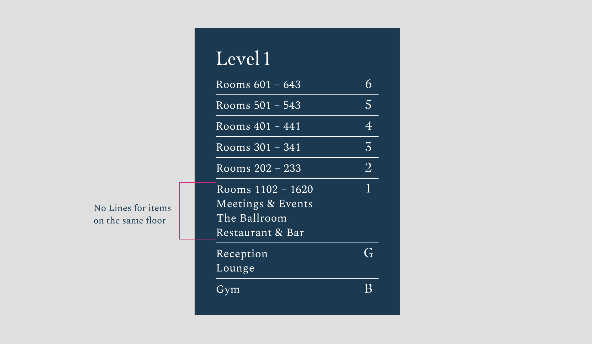 The order of the items on our wayfinding is really important. We need a system that customers can become accustomed to as they move around the hotel. Below is how the information should be structured.